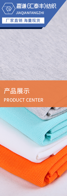 平紋布:各類拉架平紋、普通平紋、花式平紋,面料紋路清晰、光澤好,成分包括100C、100T、100N、T/C、CVC、N/C、N/T、MODAL、TENCEL、ROYAN、BAMBOO等,適宜合類休閑、運動、時尚、商務(wù)及內(nèi)衣類服飾.<br /> 珠地布:各類單雙珠、六角、斜紋珠地,珠眼飽滿、顆粒清晰,伸縮保形性好,吸濕、透氣,可兼做抗紫外、吸濕導(dǎo)汗、香味等功能,適宜各類休閑、商務(wù)、運動類T恤.<br /> 健康布:組織精密、紋路清晰、手感爽滑立挺,膚感強,適宜各類運動、休閑、時尚類服裝,成分包括100C、100T、T/C、CVC、C/R等.<br /> 衛(wèi)衣布:各類單、雙衛(wèi)衣,拉架衛(wèi)衣,布面肌理豐富,耳仔整齊,立體飽滿,有良好的吸濕透氣及保暖功能.<br /> 不倒絨:保暖、透氣,不起球、不掉毛,適宜合類休閑套裝,情侶、新套裝、保暖內(nèi)衣.<br /> 橫機面料:11、22及提花類,用于各類領(lǐng)袖及下欄配套.<br/>